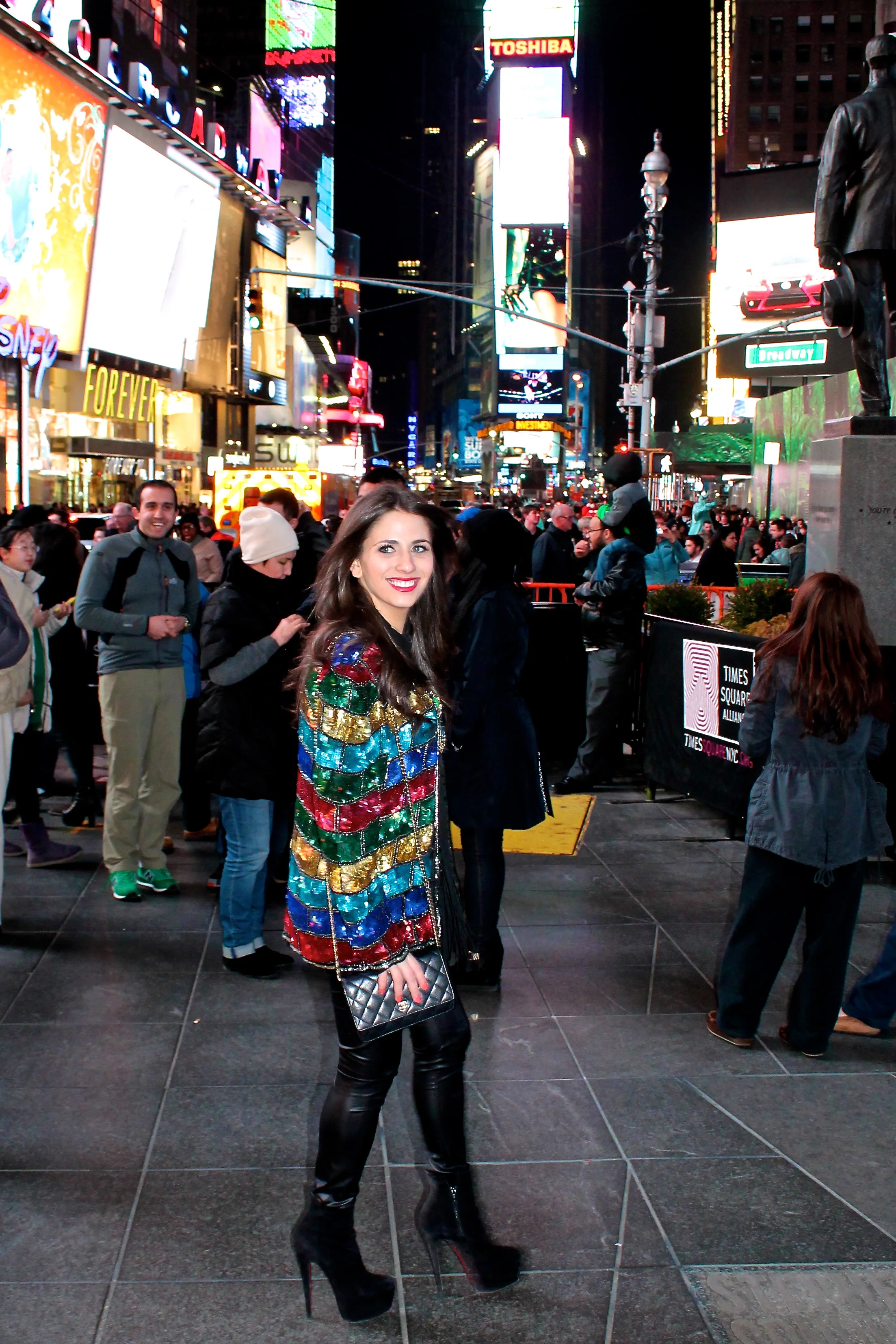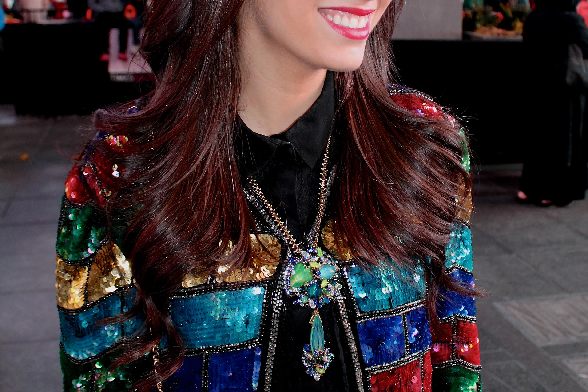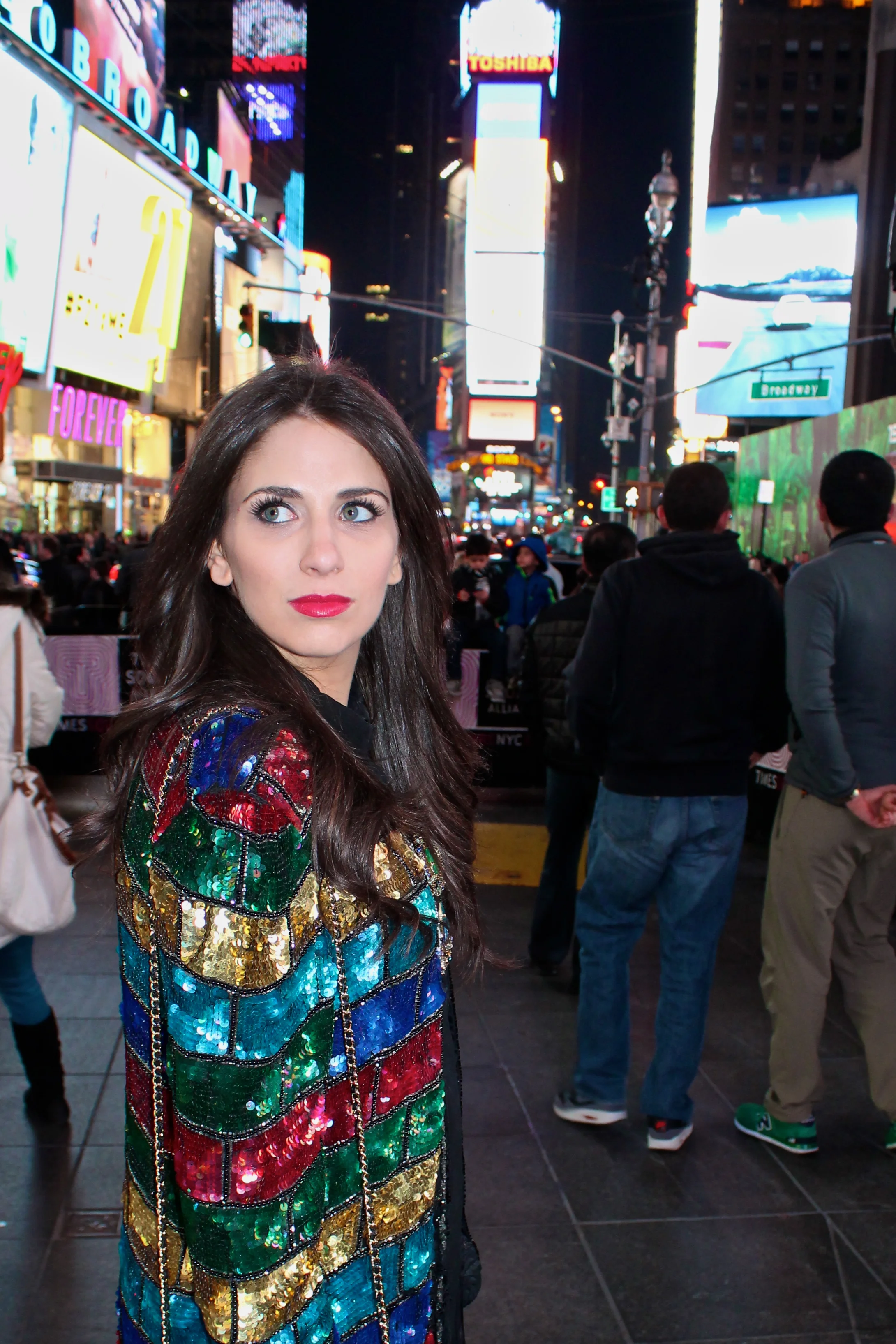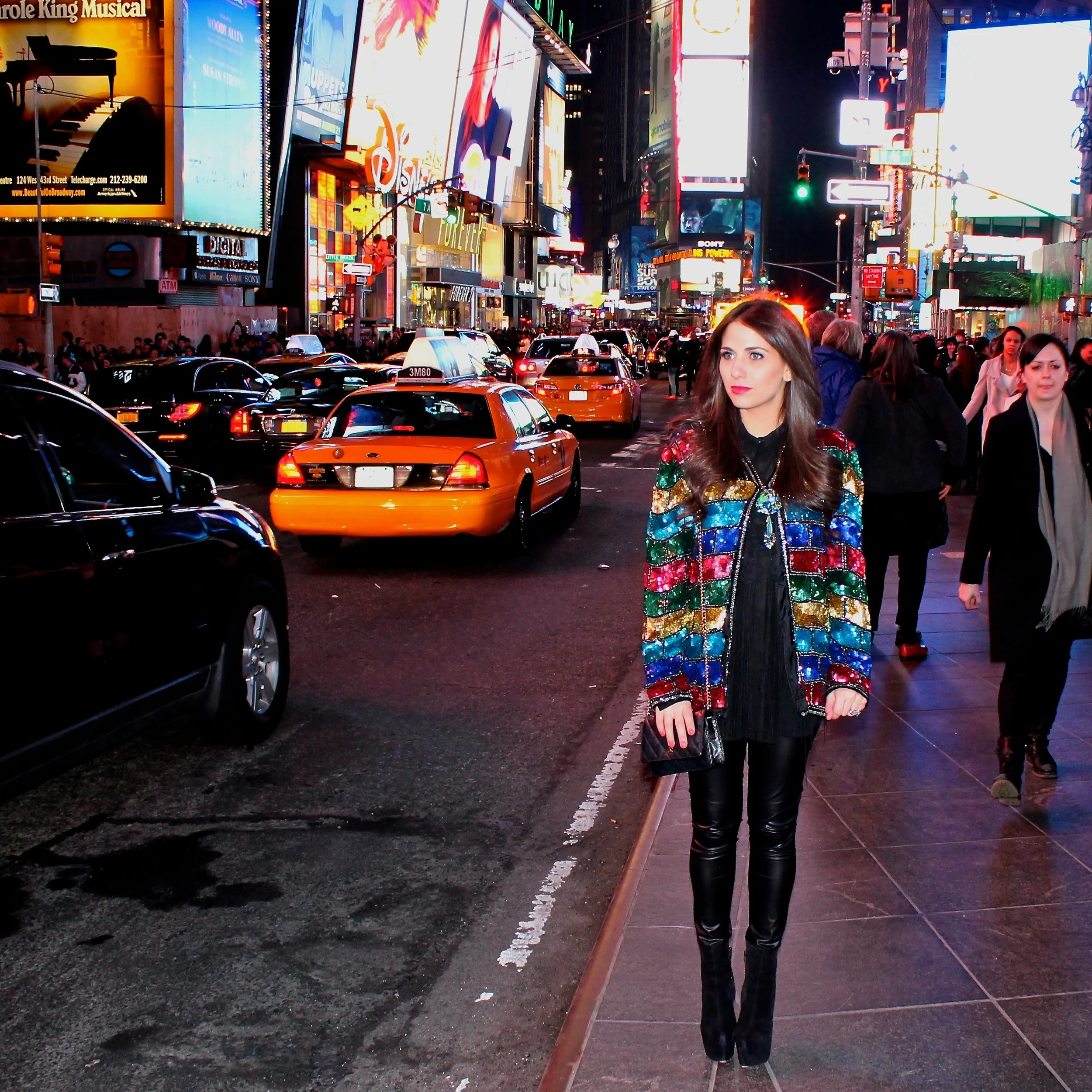 The only thing more chaotic than Times Square on a Saturday night? My vintage rainbow sequined jacket! I saw this jacket on Bib + Tuck, a super cool site where you can sell (Bib) pieces from your closet you aren't wearing, and also buy (Tuck) covetable pieces from others' closets. For whatever INSANE reason, someone no longer wished to own this rainbow sequined number, so I "Tuck"ed it immediately.
