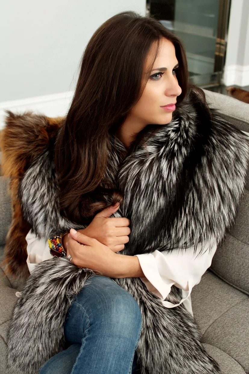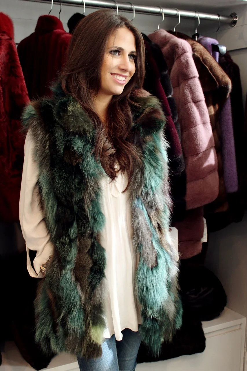 Every item in the showroom is exquisite, but I immediately gravitated to an oversized green and blue fox vest (pictured below). A vest is a great way to introduce fur into the season before it's cold enough for an actual coat. I love an oversized vest layered over a motorcycle jacket or a chunky knit cardigan. It even looks unexpectedly chic and bohemian over a patterned maxi dress--floppy hat and oversized sunnies optional! Wearing a colorful fur piece is an on-trend way to stand out in a sea of black coats. This green and blue is still subtle enough that I can work it in with most of my fall wardrobe. As much as I love a bright fuchsia moment, I think I'll try to be a teeny bit practical with this purchase.
